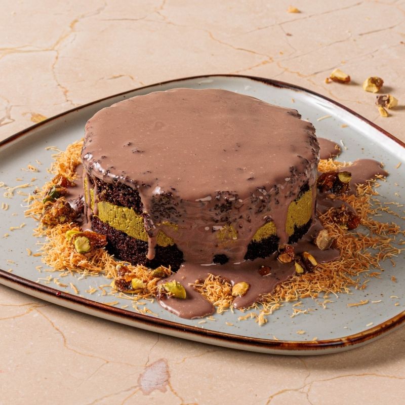 Layers of Dubai chocolate, sponge, and mixed pistachio kunafa served with milk chocolate on the side.