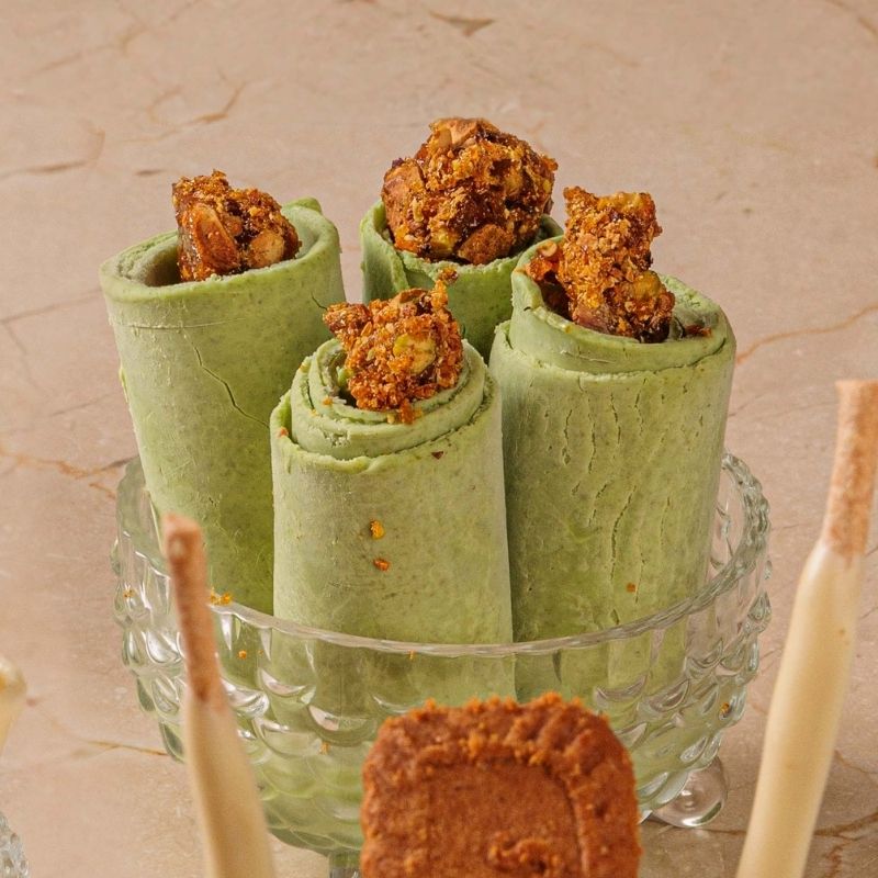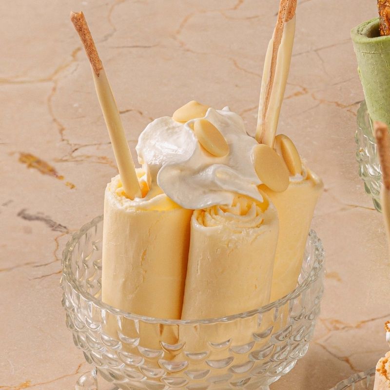 Handmade dessert made in a rich flavour created by pouring the ice cream base on a cold plate and rolled over once achieved its solid state. Flavours: Vanilla, Chocolate, Pistachio, Lotus, Oreo and Strawberry.