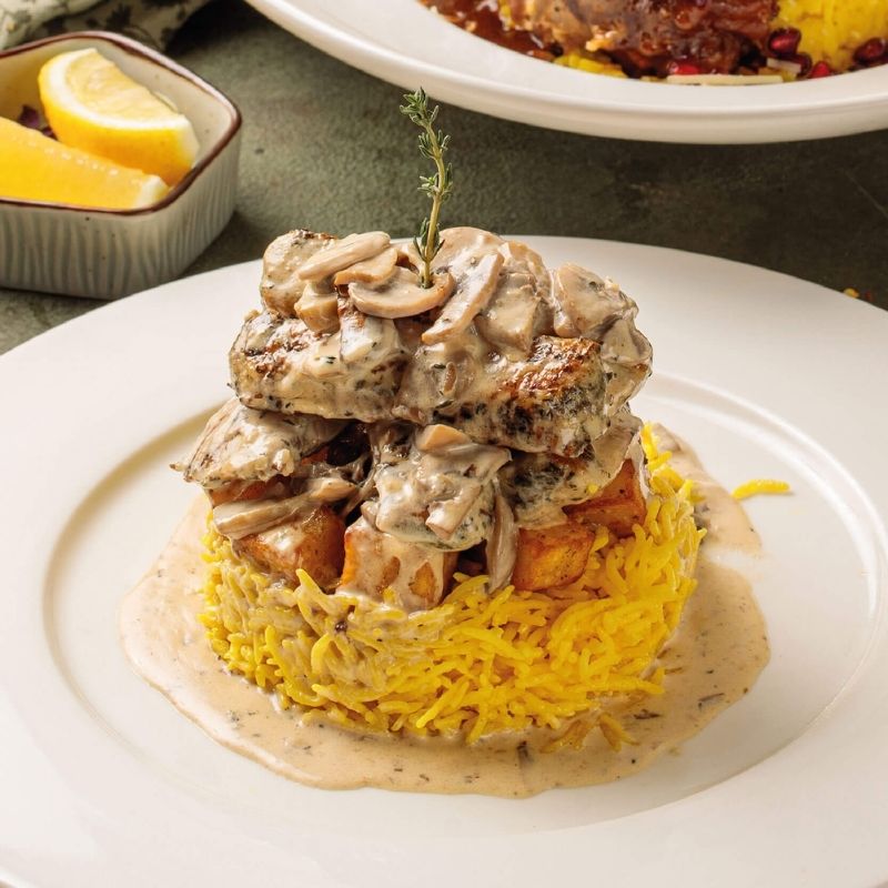 Roasted chicken with fried potato, drizzled with mushroom sauce. Served on a bed of saffron rice.