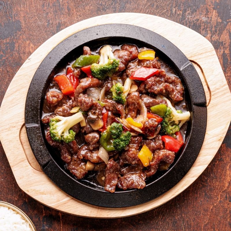 Succulent beef, fire-seared with colorful peppers and onions, presented sizzling for an unforgettable table-side experience. Serve with steamed rice.