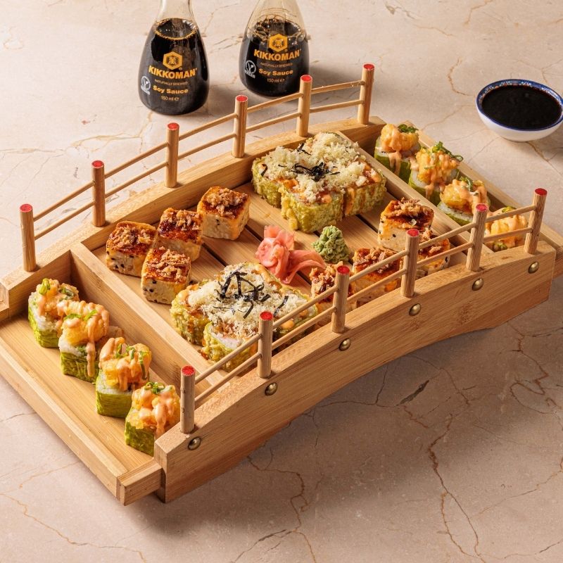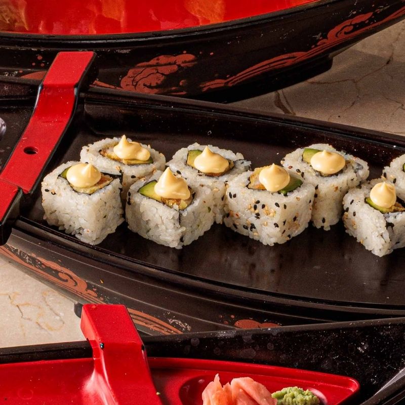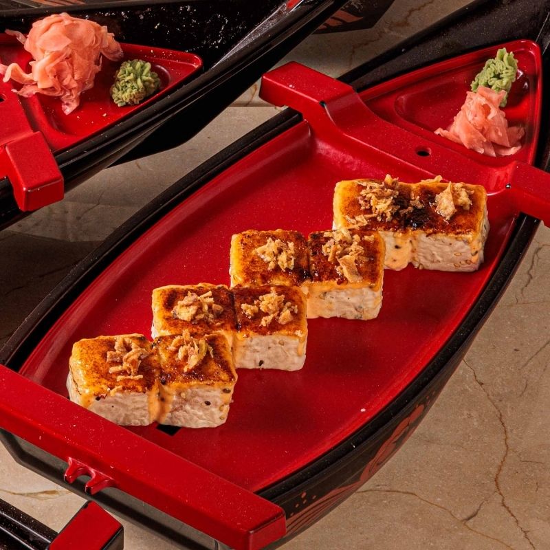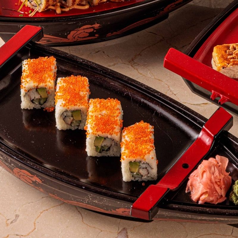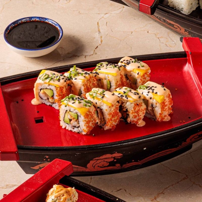 Shrimp tempura, avocado and crabstick with teriyaki and samurai sauce wrapped in nori wrapper, coated with tobiko, wrapped with sliced mango then drizzled with samurai sauce. Sprinkled with black sesame and spring onion.