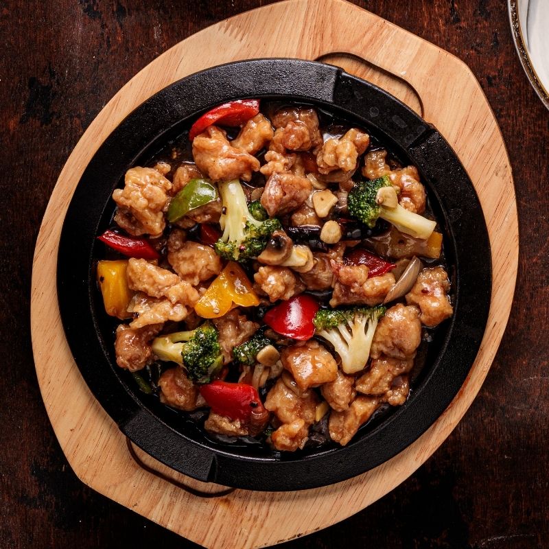 Succulent chicken, wok-seared with vibrant peppers and onions, presented sizzling for an unforgettable table-side experience. Serve with steamed rice.