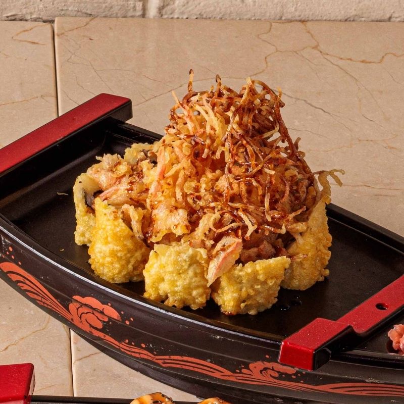 Roll of crabstick, avocado, cucumber, sushi rice with Japanese sauce wrapped with nori and deep fried, topped with crispy pickled ginger and crabstick. Drizzled with sticky teriyaki sauce.