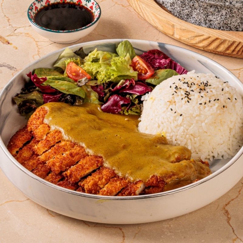 Breaded chicken with hikari Japanese sticky rice and katsu curry sauce. Served with mixed salad and garnished with mixed sesame seeds on top of the rice.
