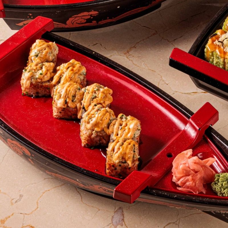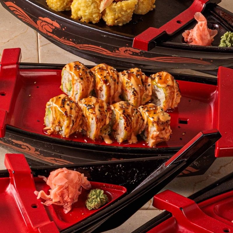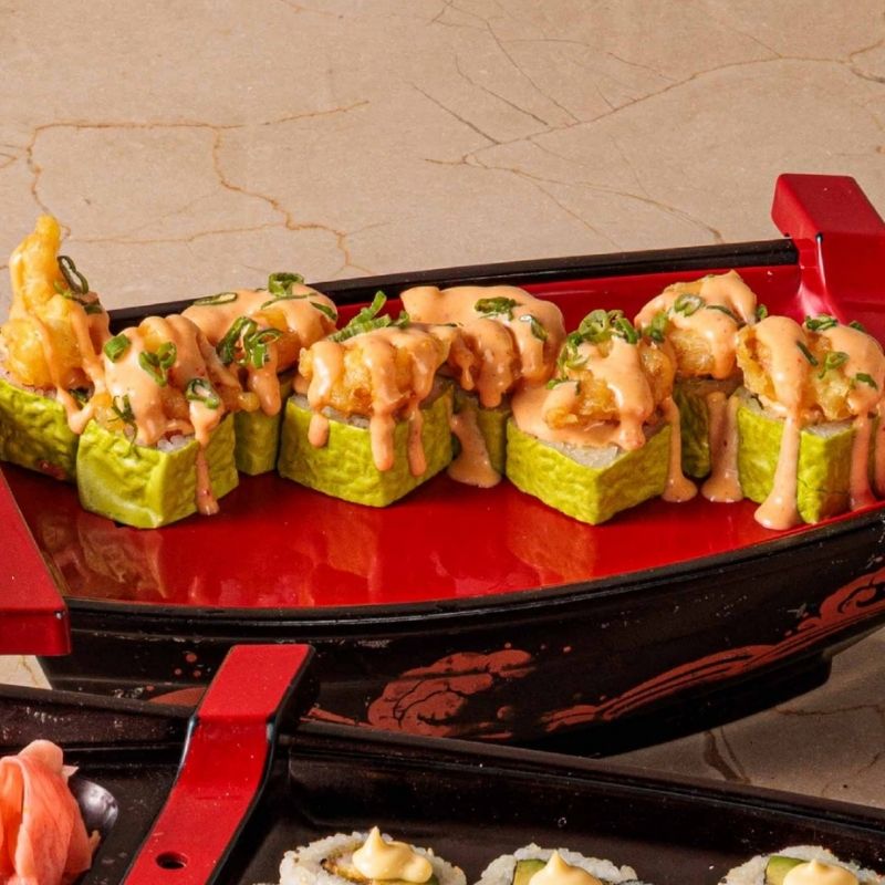 Tempura shrimp, crabstick, avocado, with cream cheese and sushi rice wrapped in a soy green wrapper deep fried and drizzled with plum sauce, dynamite sauce sprinkled with tempura flakes and shredded nori sheet.