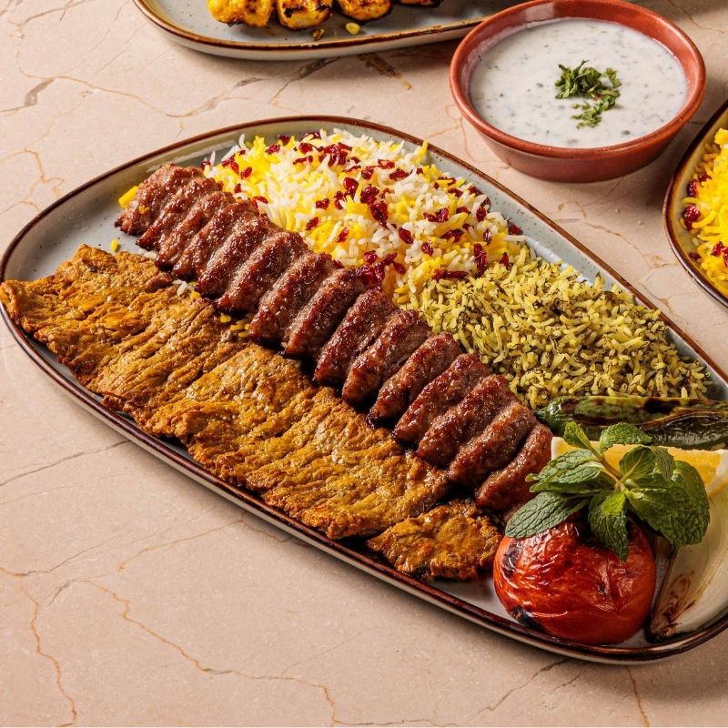 Combination of one skewer of beef fillet and one skewer of kebab meat (koobideh), served with fresh seasoned onion and chili, with aromatic rice.