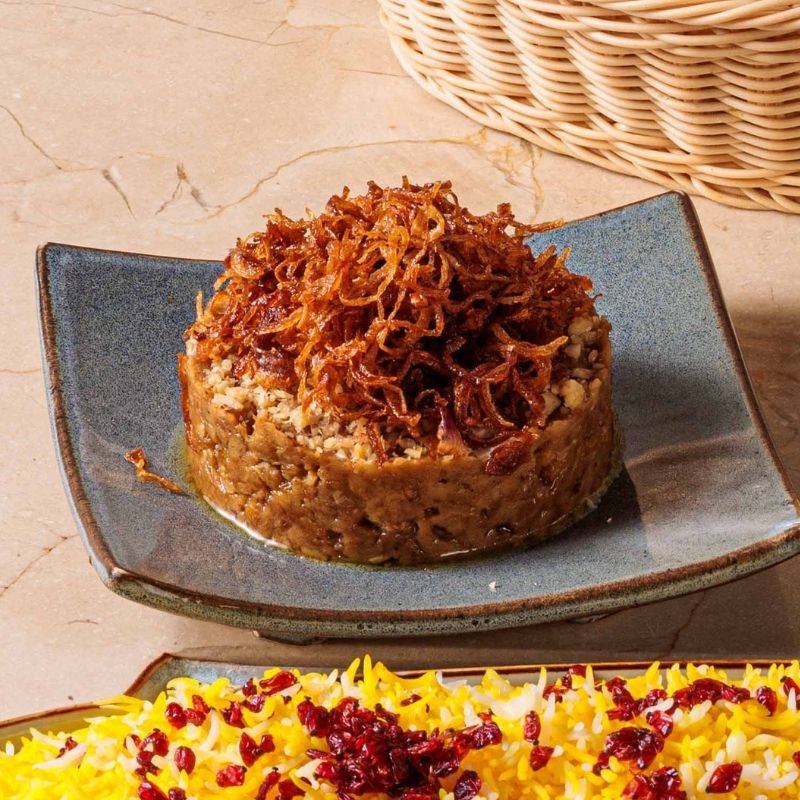 Mashed grilled eggplant with khask garnished with fried onion and Walnut.